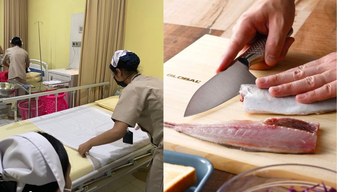 例2)海鮮居酒屋:鮮魚を捌く技術・経験が必要となるため、鮮魚と出刃包丁を購入し入学後4ヶ月目より実技研修を行う