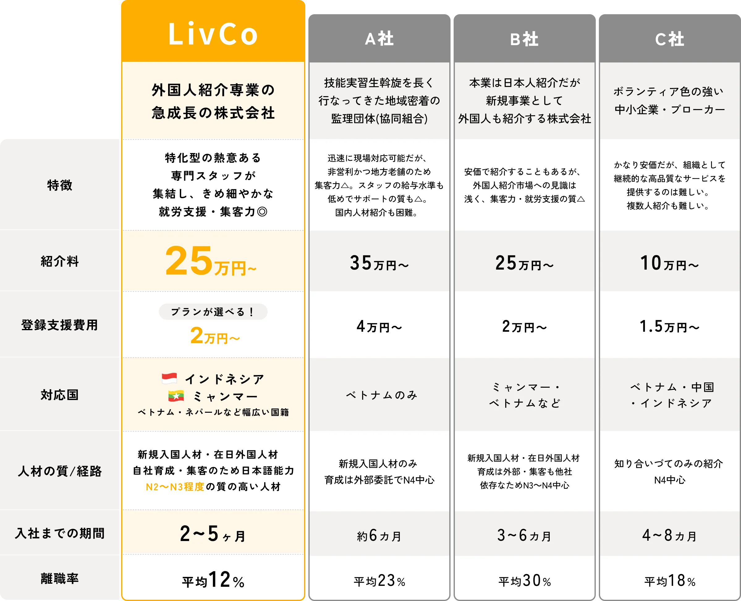 - ◎ LivCoの人材はN3中心で日本語が上手だからこそ会話の齟齬なく働け、定着率は日本人以上
